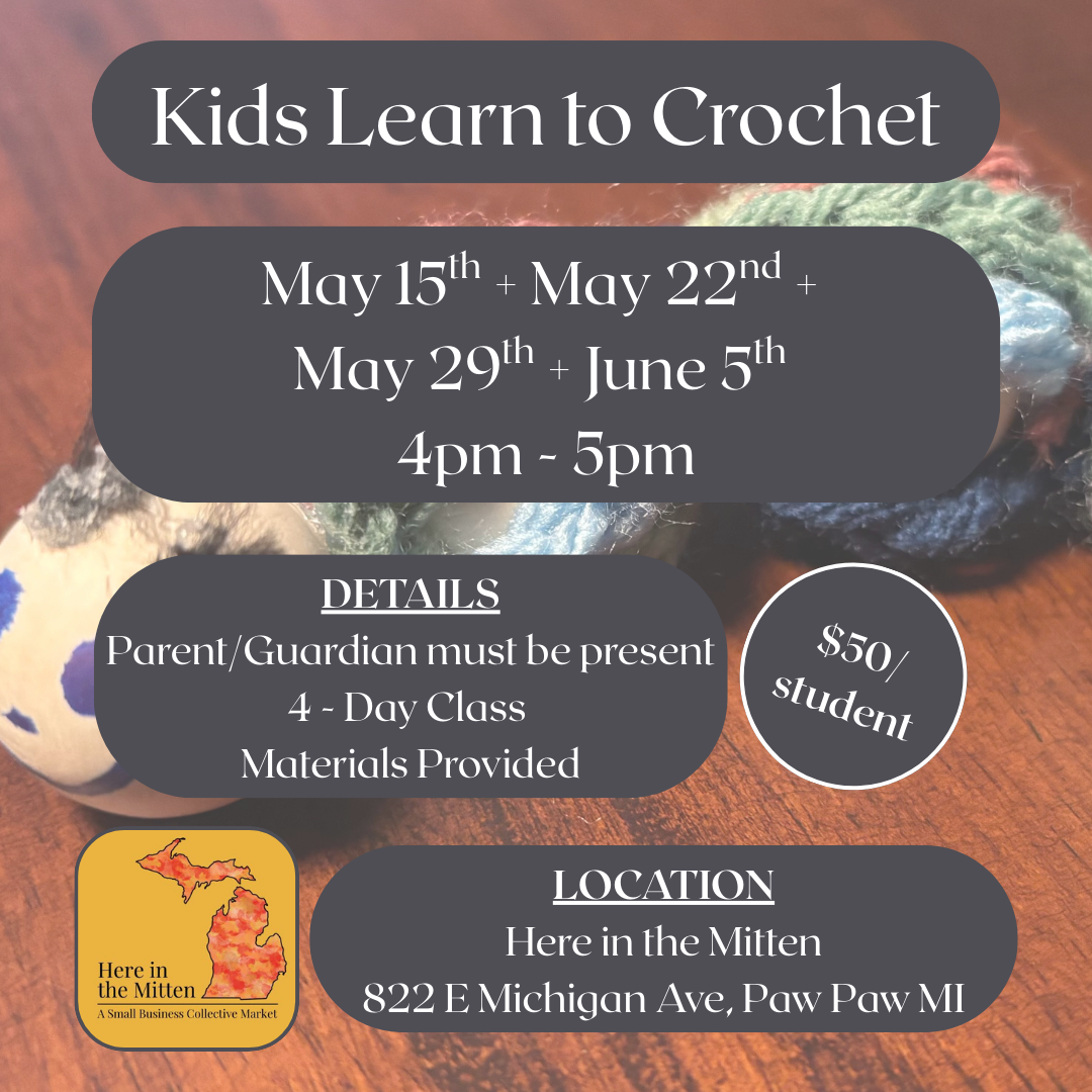 Kid's Learn to Crochet is a 4-day class. Purchase of the class grants you access to all 4 days of instruction. This session of Kid's Beginning Crochet is scheduled for Fridays, May 15th, May 22nd, May 29th, and June 5th from 4pm-5pm. Reserve your spot today as spaces are limited.